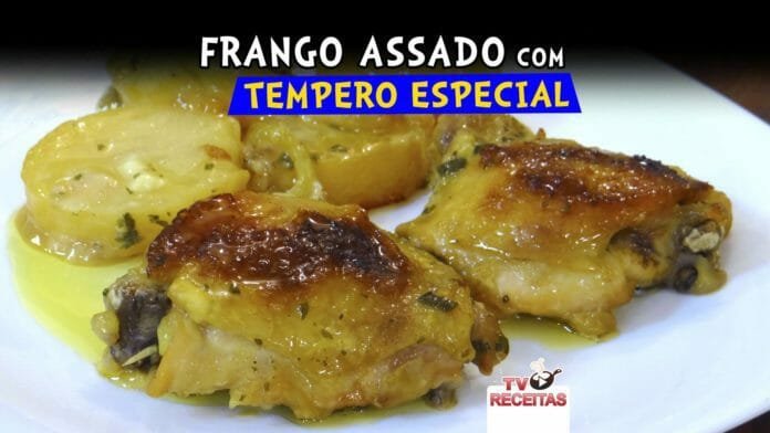 FRANGO ASSADO COM TEMPERO ESPECIAL, foi preparado com sobrecoxas, cerveja, batatas, cebolas e temperos delicioso. Confira como preparar.