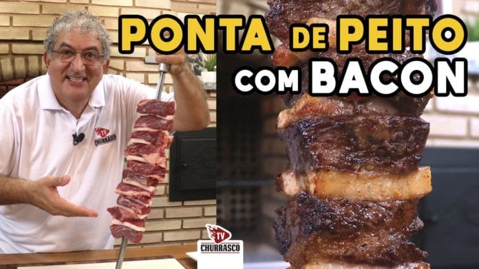 - Corte a peça da ponta de peito em 11 partes. Coloque em um espeto para churrasco intercalando com as fatias de bacon. Precisa iniciar e terminar com um pedaço de carne.
