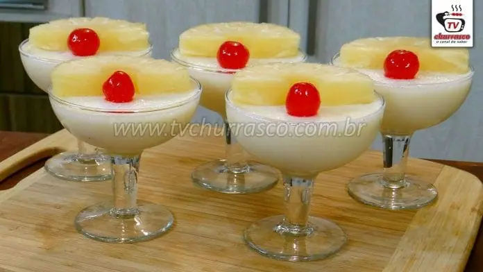 - Coloque os pedaços de abacaxi dividido entre as taças (você também pode fazer a montagem em um refratário). Acrescente o "creme" e leve à geladeira.