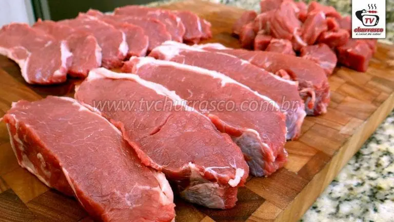 Uma parte do contra filé será cortado em cubos. Você pode usar os cubos para fazer espetinhos, carne de panela, strogonoff de carne, porção acebolada, entre outras opções.